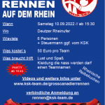Wann Samstag 10.09.2022 // ab 15:30 Wo Deutzer Rheinufer Wieviele 6 Personen + Steuermann ggf. vom KSK Was kostet´s 50 Euro pro Team Was braucht IHR Lust und Spaß Videos und weitere Infos unter: www.ksk-team.de/grosscanadierrennen